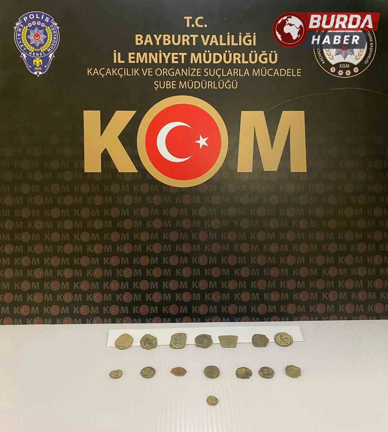 Bayburt İl Emniyet Müdürlüğü Kaçakçılık ve Organize Suçlarla Mücadele Şube Müdürlüğü ekiplerince gerçekleştirilen operasyonda, Roma dönemine ait olduğu değerlendirilen 15 adet sikke ile 40 litre etil alkol ele geçirildi.