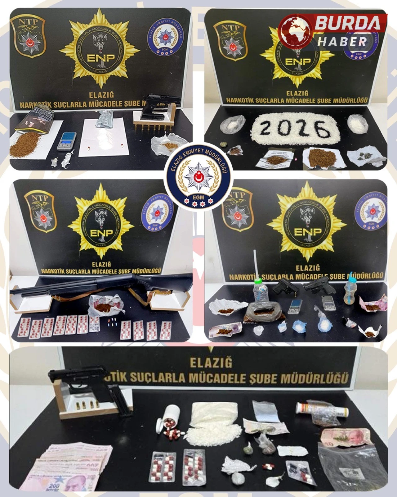 Elazığ Cumhuriyet Başsavcılığı koordinesinde İl Emniyet Müdürlüğü Narkotik Suçlarla Mücadele ve Asayiş Şube Müdürlükleri tarafından gerçekleştirilen uyuşturucu ve ruhsatsız silah operasyonlarında, 1 kilo 221 gram metamfetamin, 527 gram sentetik kannabinoid, 117 gram kokain, 635 adet sentetik ecza, 49 gram esrar ele geçirildi. Ayrıca 3 adet hassas terazi, 15 adet ruhsatsız tabanca, 36 adet fişek, 6 adet ruhsatsız tüfek ve 8 adet kartuş da operasyonlarla ele geçirilen diğer unsurlar arasında yer aldı.