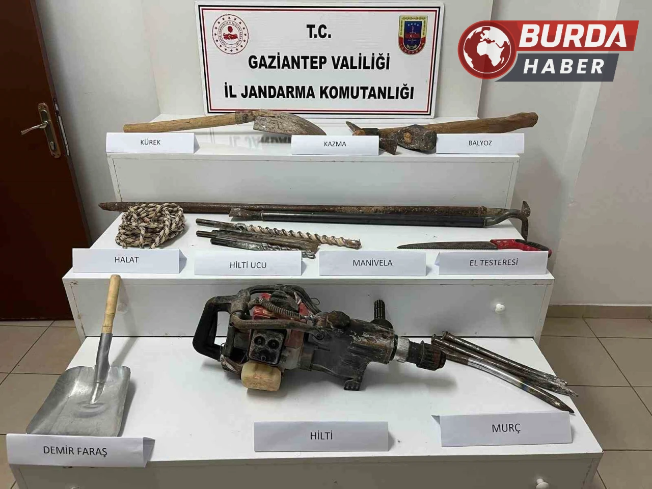 Gaziantep İl Jandarma Komutanlığı ve Cumhuriyet Başsavcılığı'nın koordinasyonunda tarihi eser kaçakçılığını önlemeye yönelik gerçekleştirilen çalışmalar kapsamında, Araban ilçesinde define aramak amacıyla izinsiz kazı yapan T.K., B.Ö., C.Ö. ve M.K.'nin suçüstü yakalandığı belirtildi. Gözaltına alınan şahıslar hakkında yasal işlem başlatıldı.