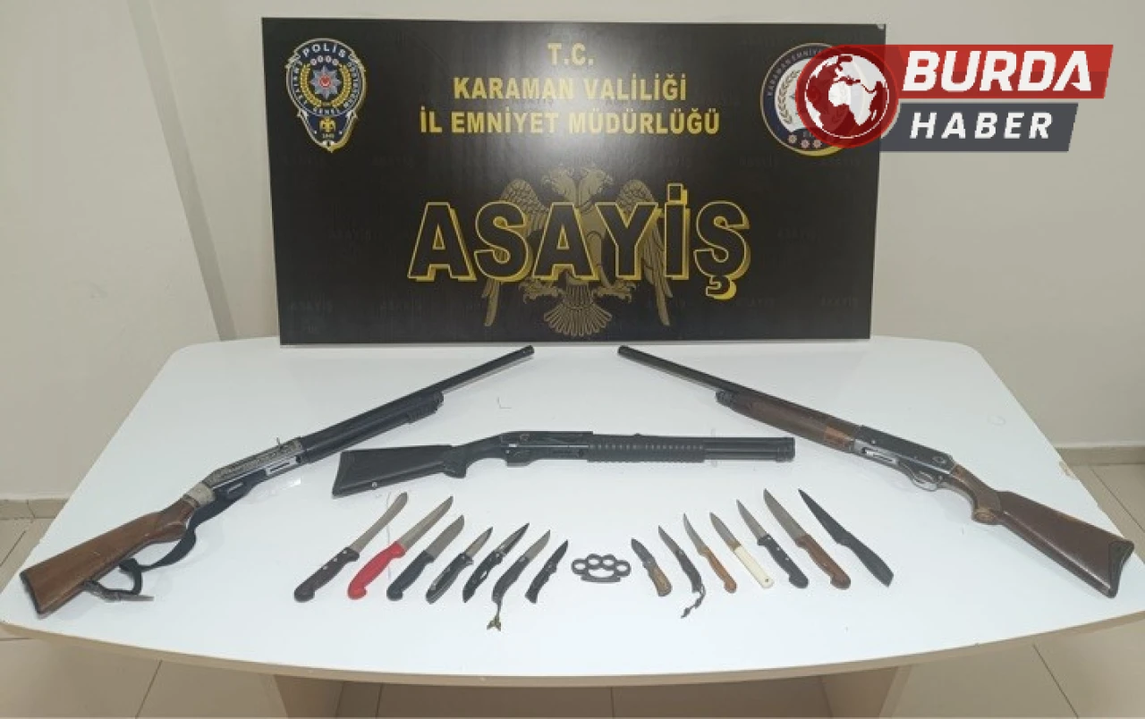 Karaman'da gerçekleştirilen asayiş ve narkotik uygulamalarında 3 adet ruhsatsız tüfek, 14 adet kesici-delici alet, 18 gram metamfetamin, 626 adet sentetik hap, 10 paket gümrük kaçağı sigara, 5 kilogram nargile tütünü, 15 adet elektronik sigara, 80 adet elektronik sigara kiti ve 5 gram esrar ele geçirilmiştir.