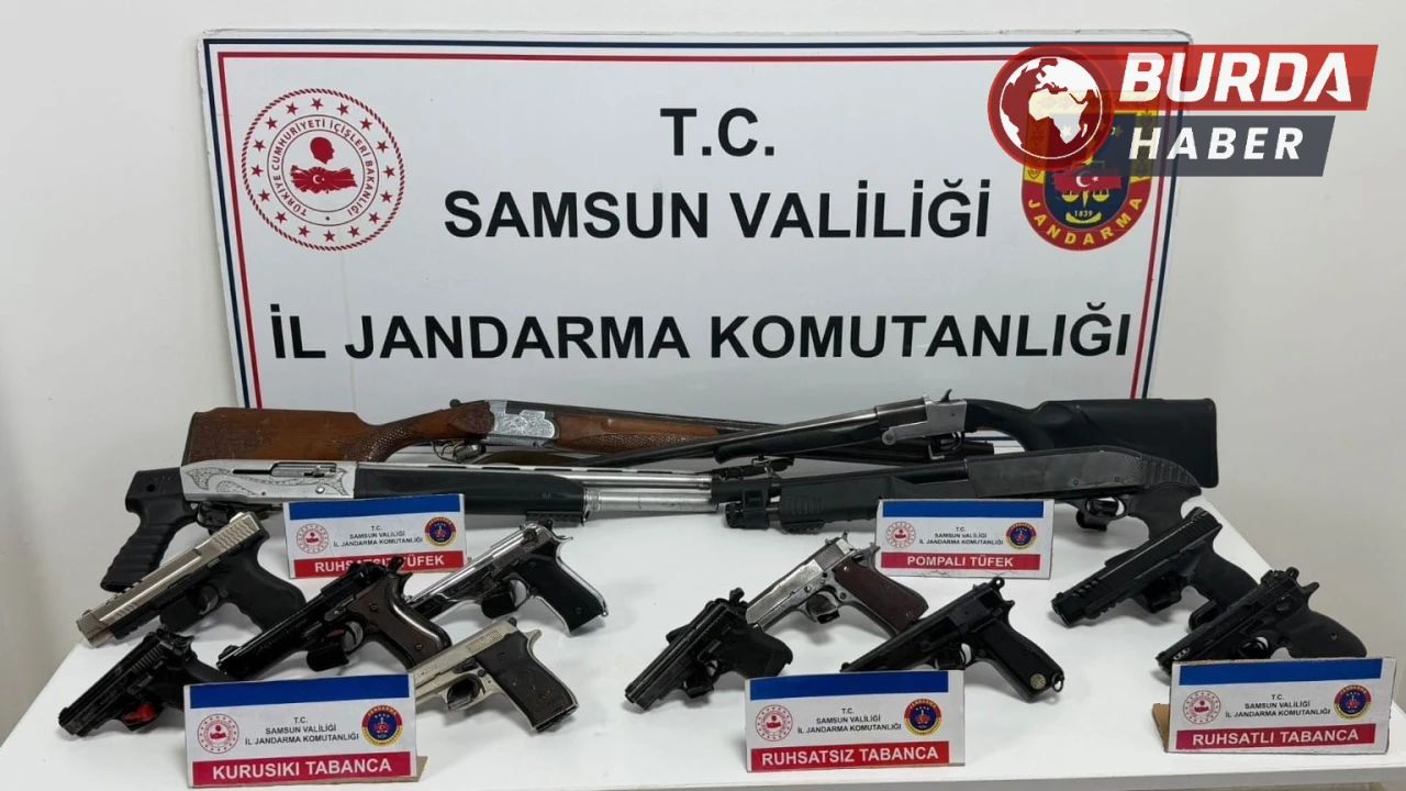 Jandarma ekipleri tarafından şahısların ikametlerinde yapılan aramalarda 5 adet kuru sıkı tabanca, 3 adet ruhsatsız tabanca, 2 adet ruhsatlı tabanca, 1 adet ruhsatlı tüfek ve 3 adet ruhsatsız tüfek bulundu.