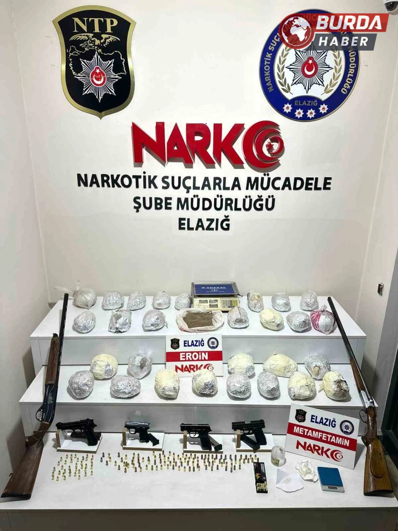 Elazığ'da gerçekleşen operasyonda, 2 ayrı adrese yapılan baskınlarda toplamda 30 kilo 800 gram eroin, 44 gram metamfetamin, 4 ruhsatsız tabanca, 183 fişek, 2 ruhsatsız tüfek, 2 hassas terazi, 19 bin 500 euro ve 10 bin TL ele geçirildi. Operasyon kapsamında 4 şüpheli gözaltına alındı ve emniyetteki işlemlerinin ardından adli makamlara sevk edildi.