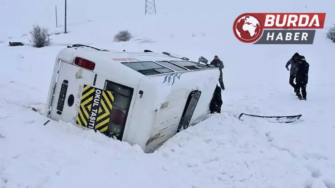 Sivas'ta meydana gelen kazada öğrenci servisi, kar yağışı ve yoldaki buzlanma nedeniyle şarampole devrildi. Kazada sürücü ve 13 öğrenci yaralandı.